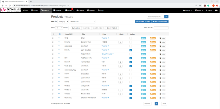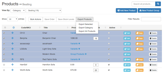 Once you click on the products button, you will have an overview of all the products in this category. Tip: To switch to another category just use the drop-down menu at the top rather than navigating backwards and forwards to the product categories page. On this page, you can search through all products which is handy if you are looking for a specific one and you can display the entries in multiples of 50, 100, 500 or all.