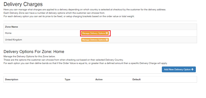 Once you have clicked on the orange ‘Manage Delivery Options’ button, it will display the list of delivery options for the selected zone. The ‘home’ zone, has no delivery options however you can add a new delivery option by using the blue ‘Add New Delivery Option’ (see picture above).