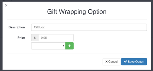 Similarly, you can add a new gift wrapping option by clicking on the blue ‘Add New Gift Wrapping Option’ button, this will bring up a replica of this box where you can add in new details rather than editing existing ones (see picture below).